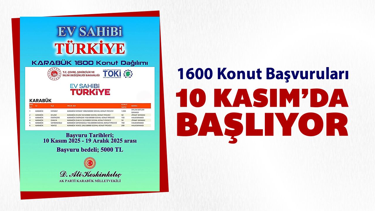 Karabük’te Çevre, Şehircilik ve İklim Değişikliği Bakanlığı ile TOKİ tarafından yürütülen "Ev Sahibi Türkiye" projesi kapsamında 1600 sosyal konut için başvurular 10 Kasım-19 Aralık 2025 tarihleri arasında alınacak.