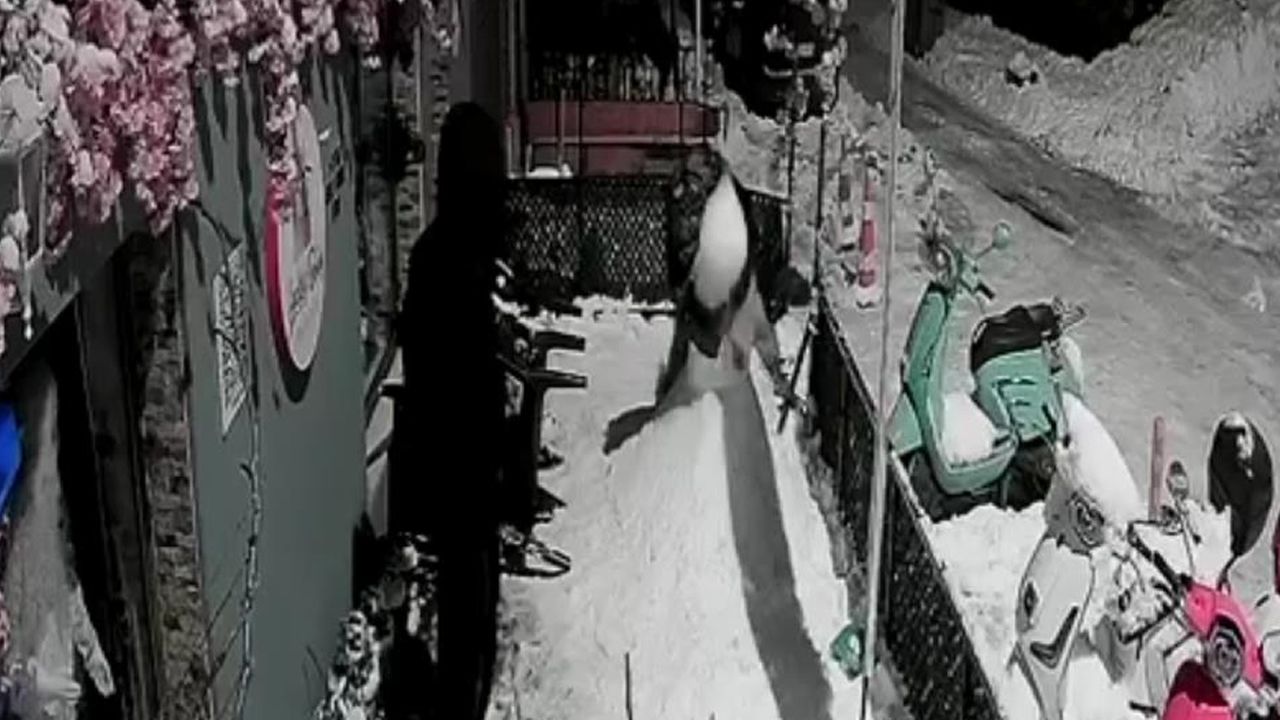 Gece saatlerinde caddeden geçen iki genç, dükkan önündeki kardan adamı fark etti. Güvenlik kamerasına yansıyan görüntülerde; gençlerden birinin kardan adamın yanından geçerken aniden duraksadığı ve bir mizansen (kurgu) başlattığı görüldü.