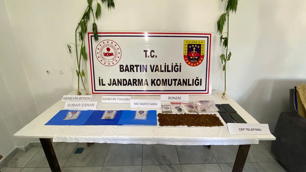 Bartın, Zonguldak, İstanbul illerinde, Bartın Jandarma Komutanlığı ekipleri tarafından şafak vakti eş zamanlı operasyon yapıldı. Operasyonlarda 4 kişi gözaltına alınırken, şahısların üzerinde ve ikametlerinde gerçekleştirilen aramalarda ise 42 gram bonzai, 1 gram metamfetamin, 1 gram kubar esrar, 4 gram kenevir tohumu, 3 kök kenevir bitkisi, 3 adet kuru sıkı tabanca, 117 adet 9 mm tabanca fişeği, 22 adet 7,65 mm tabanca fişeği, 1 adet bandrolsüz viski, 2 adet bandrolsüz votka, 1 adet kılıç, 1 adet elektronik sigara, 4 adet cep telefonu, suçtan elde edildiği değerlendirilen 54 bin 500 TL nakit para ele geçirildi.