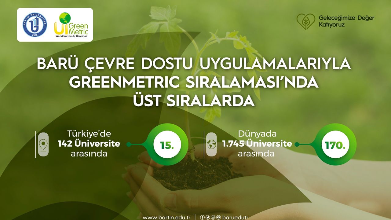 Sürdürülebilirlik alanında dünyanın en kapsamlı değerlendirmelerinden biri olan "UI GreenMetric Dünya Üniversite Sıralaması"nın (UI GreenMetric World University Rankings) 2025 yılı sonuçları açıklandı. Bu sonuçlara göre Bartın Üniversitesi (BARÜ) 105 ülkeden bin 745 yükseköğretim kurumunun yer aldığı sıralamada dünyada 170’inci oldu.