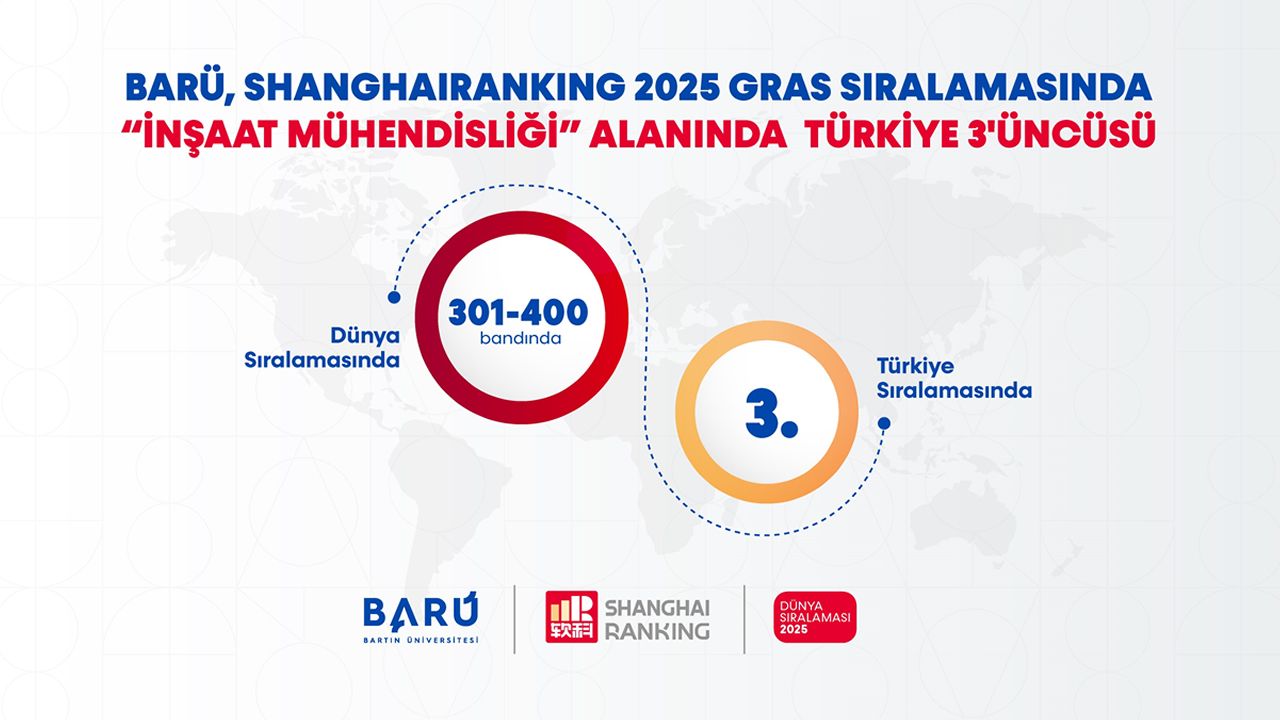 Yükseköğretim alanında dünya üniversitelerini, akademik alanlara sundukları bilimsel katkılar açısından değerlendiren en kapsamlı ve objektif değerlendirmelerden biri olan ShanghaiRanking 2025 yılı Akademik Alanların Küresel Sıralaması (Global Ranking of Academic Subjects - GRAS) yayımlandı. Bartın Üniversitesi (BARÜ) "İnşaat Mühendisliği" alanında dünyada 301-400 bandında sıralanırken Türkiye’de 3’üncü olma başarısı gösterdi.
