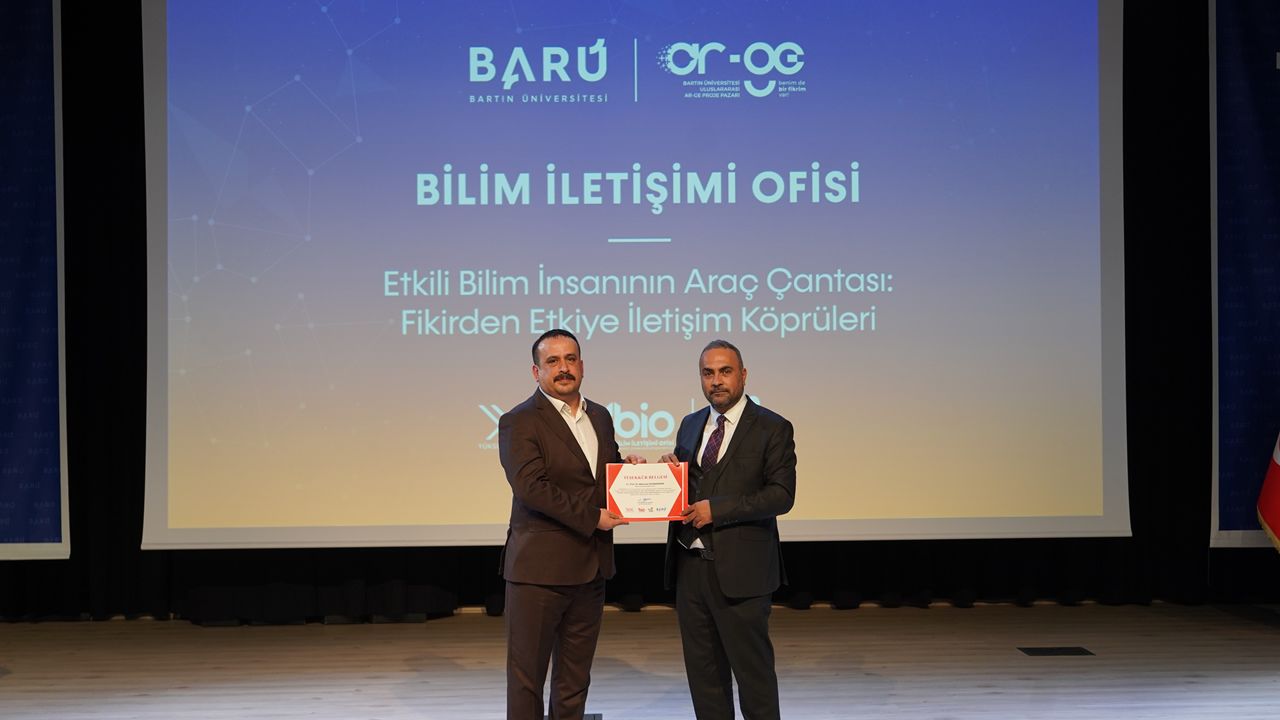 Bartın Üniversitesi (BARÜ) bilimsel bilginin toplumla buluşmasını amaçlayan Bilim İletişimi Ofisi çalışmaları kapsamında "8. Uluslararası Ar-Ge Proje Pazarı"nda bir bilim kafe etkinliği düzenledi. Ulusal ve uluslararası çalışmalarıyla "Dünyanın En Etkili Bilim İnsanları Listesi"nde yer alan BARÜ Fen Fakültesi Biyoteknoloji Bölümünden Prof. Dr. Mehmet Zahmakıran "Etkili Bilim İnsanının Araç Çantası: Fikirden Etkiye İletişim Bilgileri" başlıklı söyleşide akademik yolculuğunu katılımcılarla paylaştı.