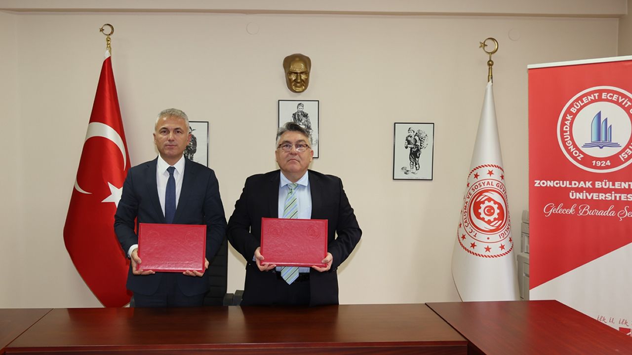 Ereğli Kömür Havzası Amele birliği Biriktirme ve Yardımlaşma Sandığı Başkanlığında düzenlenen protokol imza töreninde Zonguldak Bülent Ecevit Üniversitesi Rektörü Prof. Dr. İsmail Hakkı Özölçer ile Amele birliği Başkanı Veli Köktürk yer aldı.