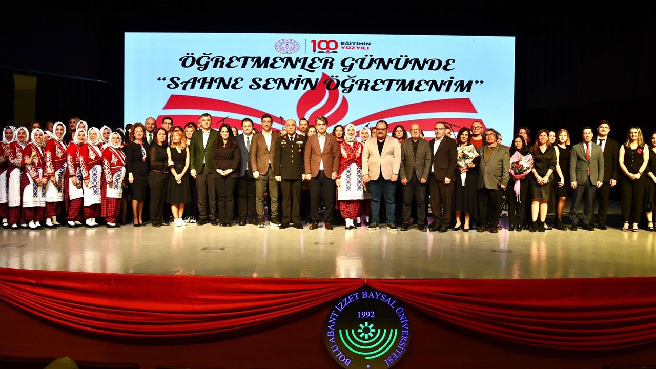 24 Kasım Öğretmenler Günü’ne özel Bolu İl Milli Eğitim Müdürlüğü tarafından ‘Sahne Senin Öğretmenim’ programı düzenlendi. Hazırlanan özel program, Abant İzzet Baysal Üniversitesi Bordo Salonu’nda yoğun katılımla gerçekleştirildi. Gecede halk oyunları, mehteran, Türk Halk Müziği ve Türk Sanat Müziği performansları izleyicilerden yoğun alkış aldı. Öğretmenlerin gönüllülük esasıyla ortaya koyduğu disiplinli çalışmalar, salonda bulunan protokol ve davetlilere unutulmaz bir gece yaşattı. Geçtiğimiz yıl 200 öğretmenle başlayan bu hareket, bugün 16 farklı yöreden oluşan geniş halk oyunları topluluğu, mehteran birimi, ritim grubu, tiyatro ekibi, şiir topluluğu, Türk Halk Müziği ve Türk Sanat Müziği koroları, semazen ekibi, traking grubu ve maarif orkestrası gibi birçok farklı alanda büyüyerek güçlü bir yapıya dönüştü. Şu an bin 379 öğretmen, tamamen gönüllülük esasıyla kültür, sanat ve spor topluluklarında aktif görev alıyor.