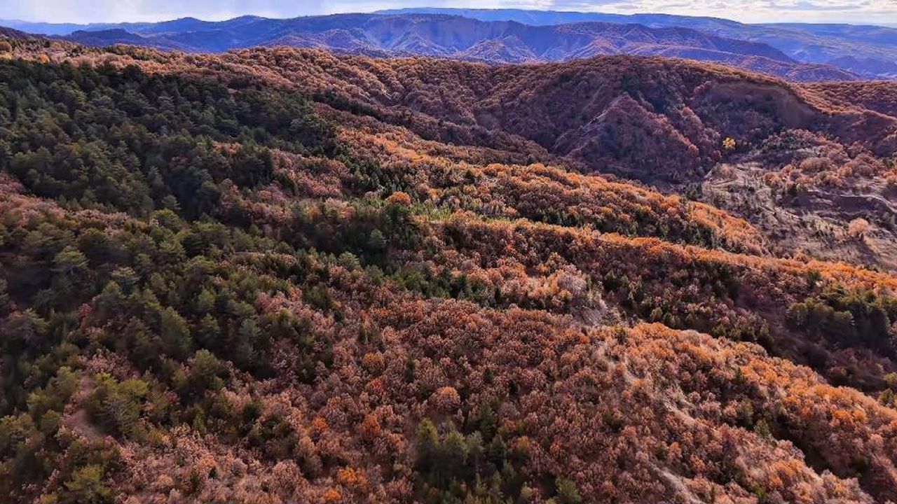 Çankırı’nın Yapraklı ilçesinde sonbaharla birlikte renk cümbüşünün başladığı ormanlar havadan görüntülendi.