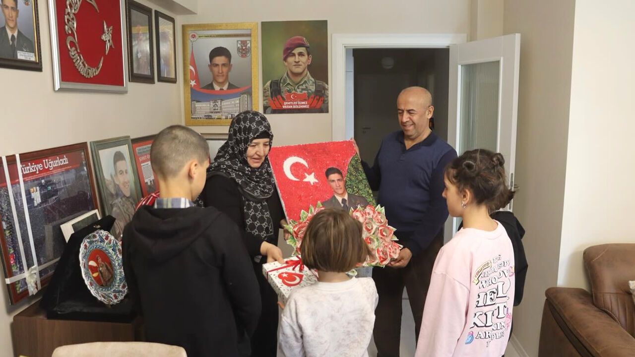 Ziyaretin en özel anlarından biri ise çocukların kendi elleriyle hazırladığı hediyeyi takdim etmesi oldu. Sevgi ve dualarla hazırlanan anlamlı hediye, “Şehidimizin ruhu şad olsun” temennisiyle aileye sunulurken, duygu dolu anlar yaşandı.