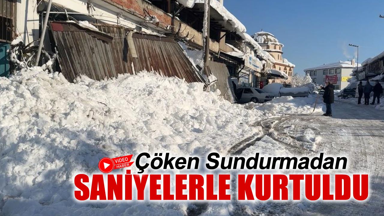 Safranbolu Sanayi Sitesi’nde meydana gelen olayda, iş yerlerinin önünde bulunan sundurmalar, çatılarda biriken karın ağırlığını taşıyamayarak çöktü. Çökmeden sadece 10 saniye önce bir esnafın, dükkanına girmesi ihtimali bir facianın önüne geçti. O anlar güvenlik kamerasına yansıdı.