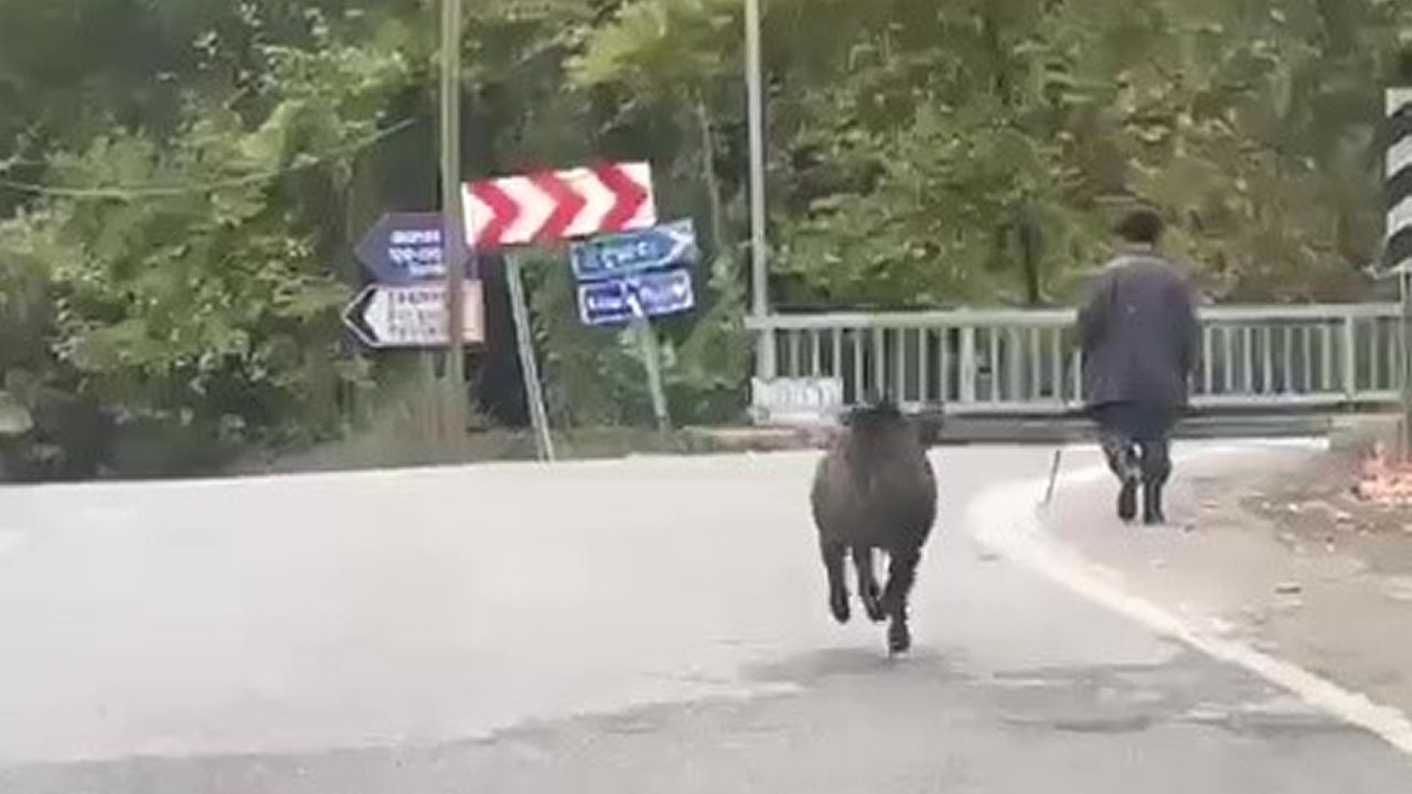 Zonguldak'ın Devrek ilçesine bağlı Yağmurca köyünde, araçla ilerleyen bir sürücü tarafından kaydedilen görüntülerde ilginç bir an yaşandı. Görüntülerde, köy yolunda bir domuzun hızlı bir şekilde koştuğu görülüyor. Yol kenarında yürüyen yaşlı adama çarpacak gibi olan domuz, adamın son anda refleks göstermesiyle yoluna devam etti.
