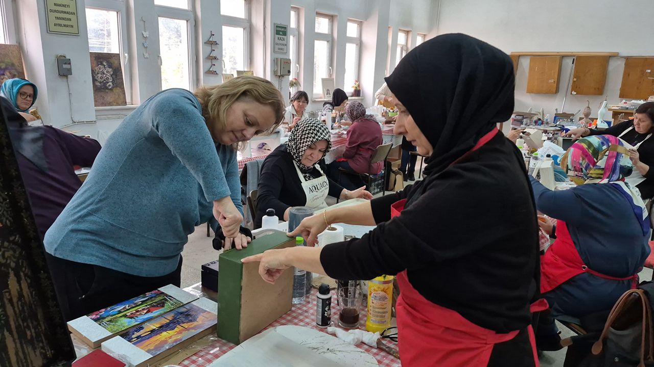 Bir diğer kursiyer Özlem Akdeniz ise kurs hakkında bilgiler vererek, "Burada su kabağı işliyorum. Bunlar kendi bahçemde yetiştirdiğim ürünler. Zor mu evet zor vakit ayırıyoruz ama çok da keyifli. Erkeklerle özdeşleşen ahşap ustalığı için biz bir kere bu atölyenin kokusunu aldık. Zorlukları var ama o kısmı görmüyoruz. Erkek işi gibi görünse de biz onları geçiyoruz. Zorlandığımız konu hepimiz ev hanımıyız, çocuklarımız var. Biz onlardan zaman ayırıp buraya geliyoruz. Sadece o biraz zorlayıcı olabiliyor, onun dışında zorlanmıyoruz" diye konuştu.