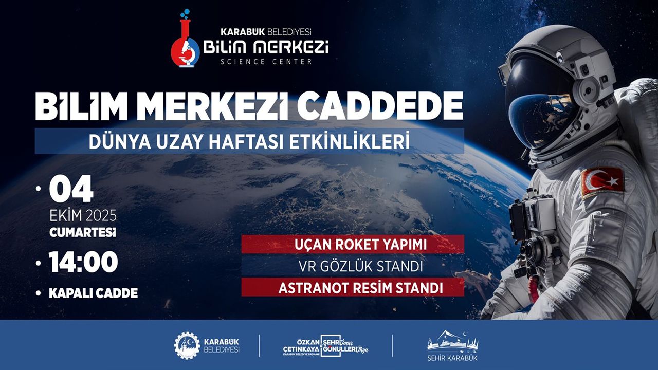Karabük Belediyesi Bilim Merkezi, Dünya Uzay Haftası dolayısıyla özel bir program düzenliyor. 4 Ekim 2025 Cumartesi günü saat 14.00’te Kemal Güneş Caddesi(Kapalı Cadde)’nde gerçekleştirilecek etkinlikler, her yaştan katılımcıya bilimsel ve eğitici deneyimler sunacak.