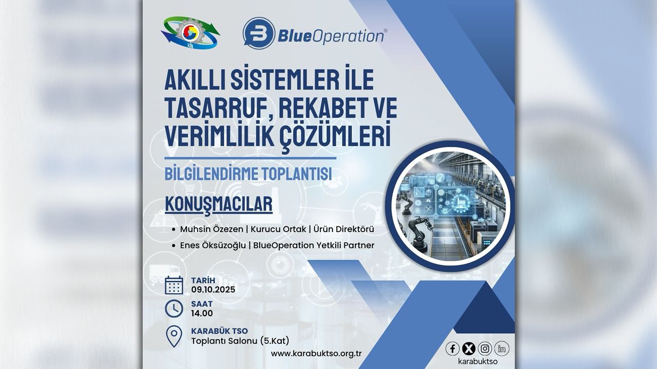 Karabük Ticaret ve Sanayi Odası (KTSO), BlueOperation iş birliğiyle “Akıllı Sistemler ile Tasarruf, Rekabet ve Verimlilik Çözümleri” konulu bilgilendirme toplantısına ev sahipliği yapacak.