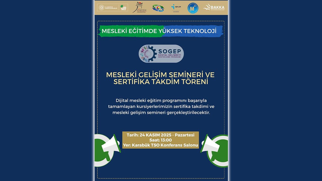 Mesleki Eğitimde Yüksek Teknoloji Projesi kapsamında gerçekleştirilecek Mesleki Gelişim Semineri ve Sertifika Takdim Töreni, 24 Kasım 2025 Pazartesi günü saat 13.00'te Karabük TSO Konferans Salonu'nda yapılacak.