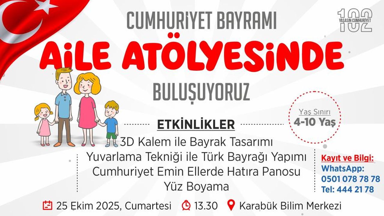 Cumhuriyet Bayramı Aile Atölyesi adıyla gerçekleştirilecek etkinlik, 25 Ekim Cumartesi günü saat 13.30’da Karabük Bilim Merkezi’nde yapılacak. Etkinlikte 4-10 yaş aralığındaki çocuklar, 3D kalemle bayrak tasarımı, Türk bayrağı yapımı, "Cumhuriyet Emin Ellerde" hatıra panosu ve yüz boyama gibi çeşitli atölye çalışmalarına katılabilecek.