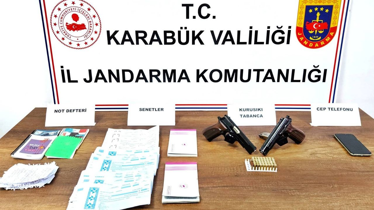 Karabük Merkez'de gerçekleştirilen operasyonla şahısların ikametlerinde arama yapıldı. Yapılan aramada, 4 adet borç/alacak defteri ve 18 adet borçların yazılı olduğu not kağıtları, 81 adet boş senet, 2 adet kurusıkı tabanca, bu tabancalara ait 2 adet şarjör, 44 adet kurusıkı tabanca fişeği ve 1 adet cep telefonu ele geçirildi.