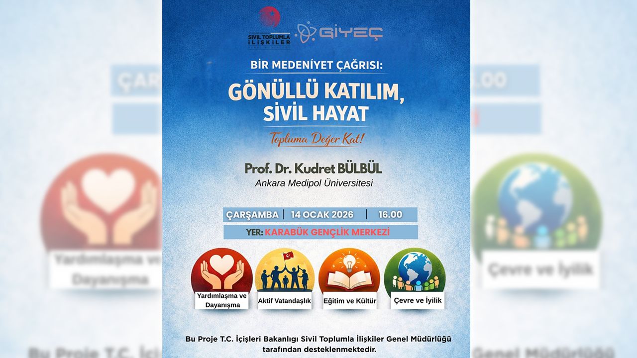 “Bir Medeniyet Çağrısı: Gönüllü Katılım, Sivil Hayat” başlığıyla gerçekleştirilecek program, 14 Ocak Çarşamba günü saat 16.00’da Karabük Gençlik Merkezi’nde yapılacak.