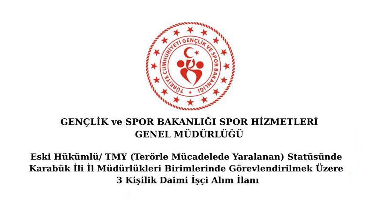 Gençlik ve Spor Bakanlığı Spor Hizmetleri Genel Müdürlüğü tarafından Karabük’te istihdam edilmek üzere 3 kişilik daimi işçi alımı yapılacağı duyuruldu. Alımın, eski hükümlü ve Terörle Mücadelede Yaralanan (TMY) statüsünde gerçekleştirileceği bildirildi.