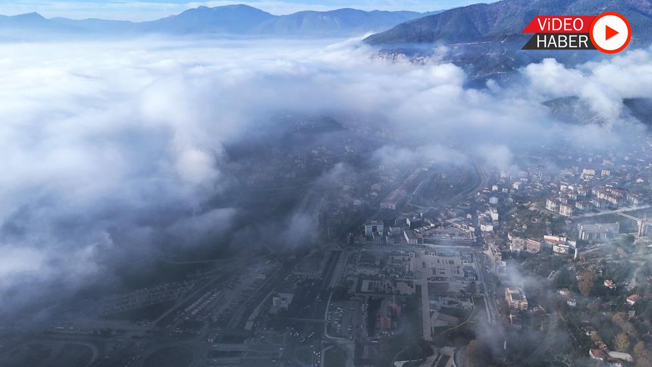 Karabük'te sabah saatlerinde etkili olan ve kentin üzerini adeta beyaz bir örtü gibi saran sis, havadan görüntülendi.