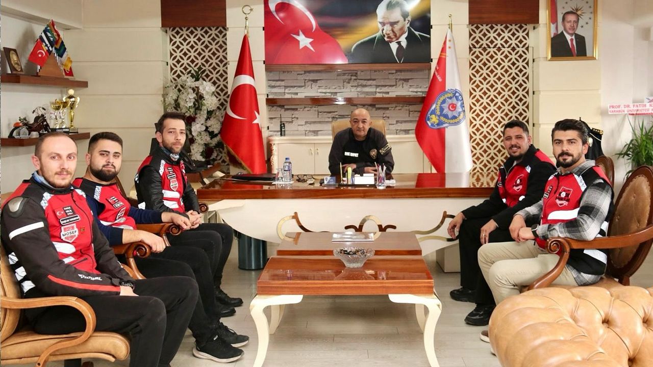 Karabük’te faaliyet gösteren Kask Kafalılar Motosiklet Derneği Başkanı Umut Kahriman ile Yönetim Kurulu üyeleri, Karabük İl Emniyet Müdürü Ahmet Canver’i makamında ziyaret etti.
