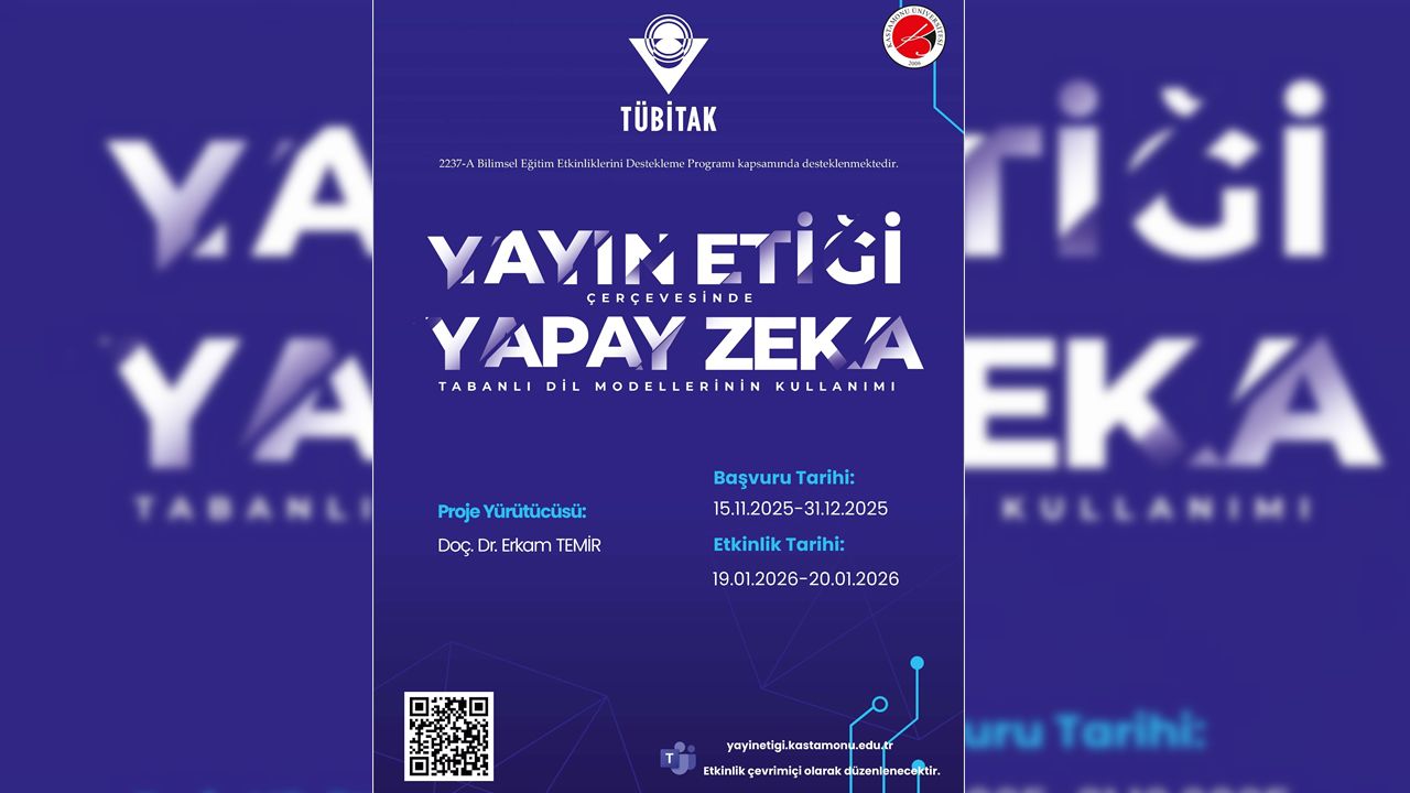 Kastamonu Üniversitesi İletişim Fakültesi öğretim üyesi Doç. Dr. Erkam Temir'in yürütücülüğünü yaptığı proje kapsamında, TÜBİTAK desteğiyle akademik dünyada hızla artan yapay zeka kullanımının doğurduğu etik ve hukuki sorunlara karşı kapsamlı bir farkındalık oluşturulacak. 2237-A Bilimsel Eğitim Etkinlikleri Destekleme programı kapsamında desteklenen, "Yayın Etiği Çerçevesinde Yapay Zeka Tabanlı Dil Modellerinin Kullanımı" eğitimi için başlayan başvurular, 31 Aralık tarihine kadar devam decek. 19-20 Ocak 2026 tarihinde çevrimiçi olarak ücretsiz bir şekilde gerçekleştirilecek eğitim için Türkiye genelindeki lisansüstü öğrenciler ve akademisyenler Kastamonu Üniversitesi'nin resmi web sitesi üzerinden başvuru yapabilecek.