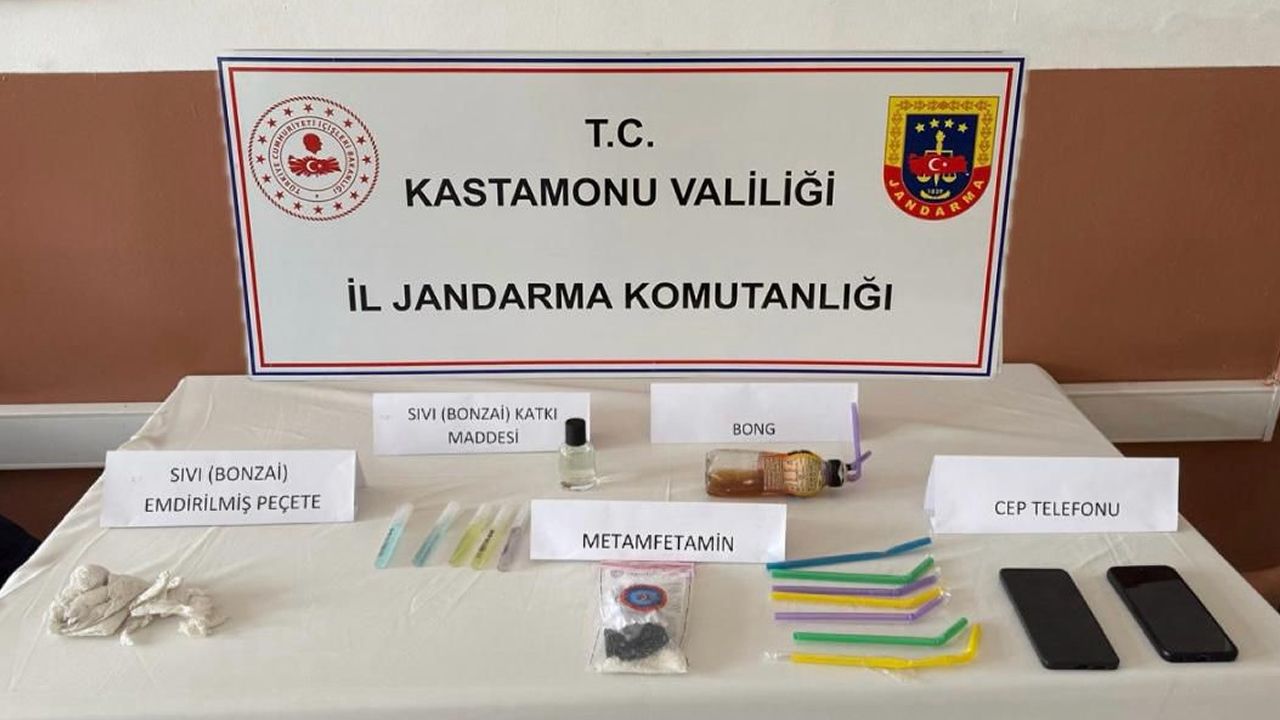 Edinilen bilgiye göre, Kastamonu İl Jandarma Komutanlığı ekipleri tarafından uyuşturucuyla mücadele kapsamında yürütülen çalışmalar neticesinde, 20 gram metamfetamin, 5 adet şişe halinde 90 mililitre sıvı sentetik kannabinoid katkı maddesi, 500 kullanımlık kannabinoid sıvı madde emdirilmiş 4 adet nemli kıvamda peçete parçası, 190 adet makarona doldurulmuş halde 95 gram kannabinoid katkılı tütün maddesi, 3 adet fişek halinde 5 gram kannabinoid katkılı tütün maddesi, 1 paket tütün sarma kağıdı, 5 adet cep telefonu ve 6 adet SIM kartı, 1 adet bong olarak tabir edilen uyuşturucu madde içme aparatı ele geçirildi.