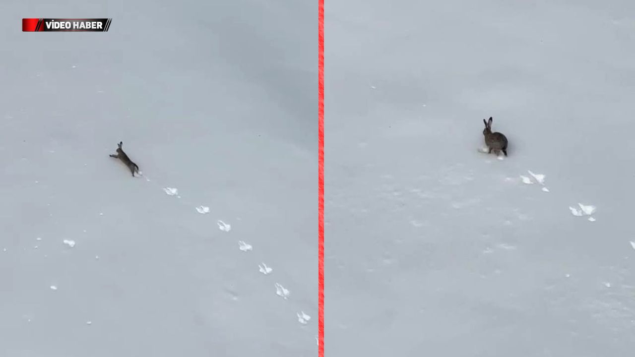 Karabük'te Keltepe Kayak Merkezi'nde kar üzerinde koşan bir yaban tavşanı, bir vatandaş tarafından cep telefonu kamerasıyla görüntülendi.