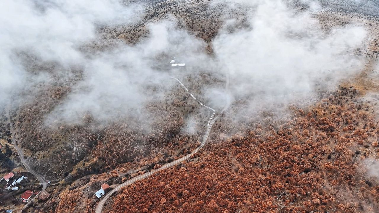 Çankırı'nın Korgun ilçesinde sabah saatleri itibarıyla sis etkili olmaya başladı. İlçedeki ormanlar da sis bulutlarıyla kaplandı. Sonbaharda kahverenginin farklı tonlarına bürünen ormanlarda sis ile birlikte ortaya kartpostallık görüntüler çıktı. Mest eden sis manzarası havadan görüntülendi.