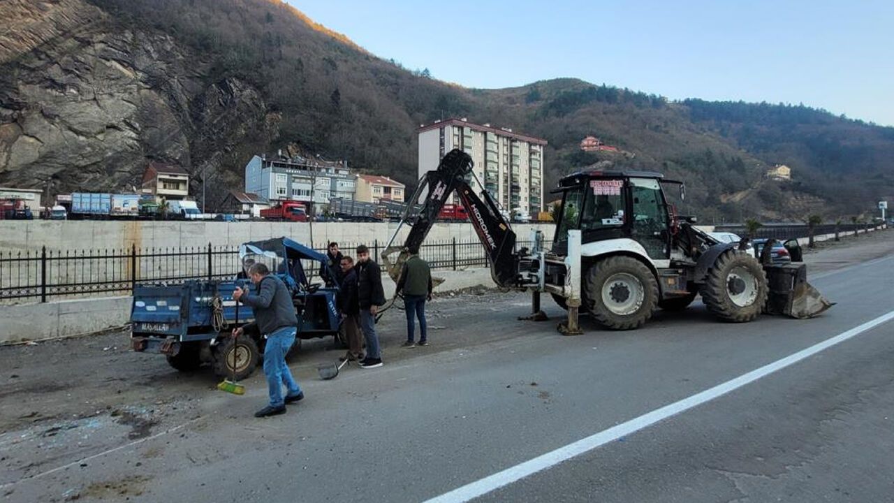 Kaza anı ise güvenlik kamerasına yansıdı. Görüntülerde, tarım aracının lastiğinin yerinden çıktığı ve aracın savrularak takla attığı görülüyor.