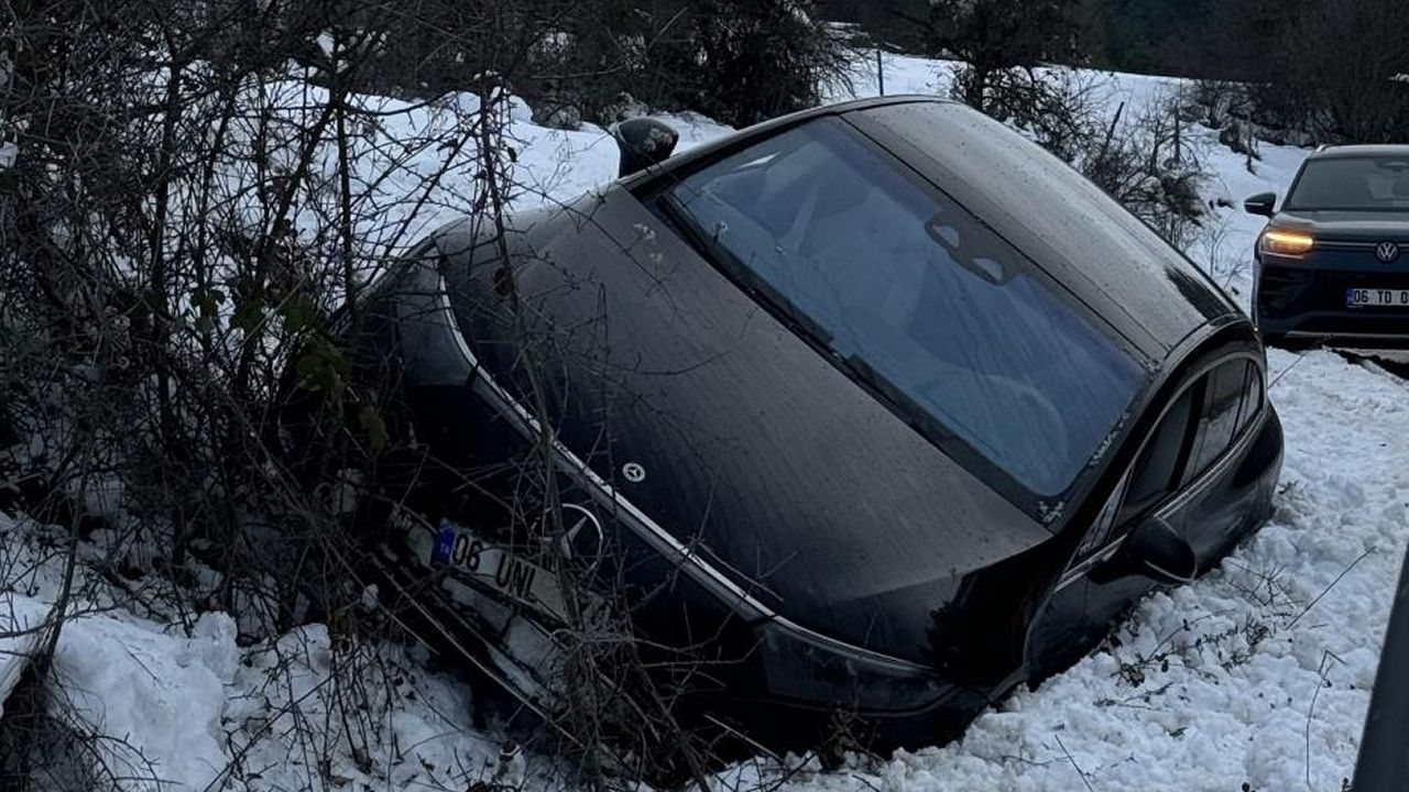 Bolu’da Kartalkaya yolunda kontrolden çıkan lüks otomobil, kontrolden çıkarak yol kenarındaki kar birikintisine saplandı.