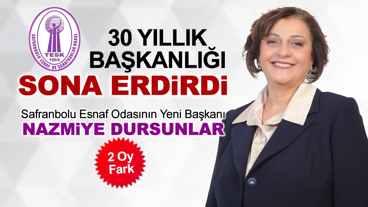 Safranbolu Esnaf ve Sanatkârlar Odası’nda uzun yıllardır başkanlık görevini yürüten Muammer Dumaner, bu seçimle birlikte koltuğunu Nazmiye Dursunlar’a devretmiş oldu. Dursunlar’ın kazanmasıyla birlikte odada yaklaşık 30 yıllık bir dönem resmen kapanmış oldu.
