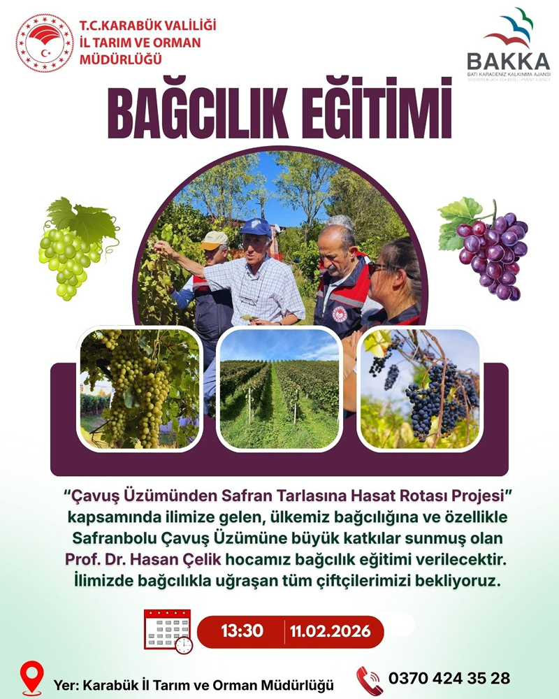 Ülke bağcılığına ve özellikle Safranbolu Çavuş üzümünün geliştirilmesine önemli katkılar sunan Prof. Dr. Hasan Çelik’in vereceği eğitimde, üreticilere bağcılıkta verim ve kaliteyi artırmaya yönelik bilgiler aktarılacak.