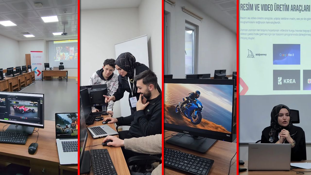 Program kapsamında resim, video ve ses üretiminde kullanılan yapay zekâ araçlarının uygulamalı tanıtımları yapıldı. Katılımcılar, HHGPT ve Cemile gibi platformların detaylı kullanım yöntemlerini öğrenerek bu araçların pratikte nasıl çalıştığını deneyimledi.