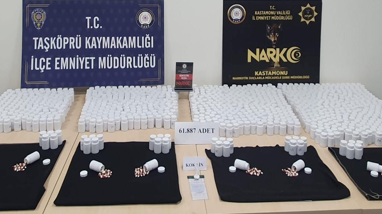 Edinilen bilgiye göre, Kastamonu İl Emniyet Müdürlüğü ile Taşköprü İlçe Emniyet Müdürlüğü ekiplerince şüphe üzerine iki araç durdurularak arama yapıldı. Taşköprü ilçesinde durdurulan iki araçta yapılan aramalarda 3 gram kokain ve 61 bin 877 adet sentetik ecza hapı ele geçirildi.