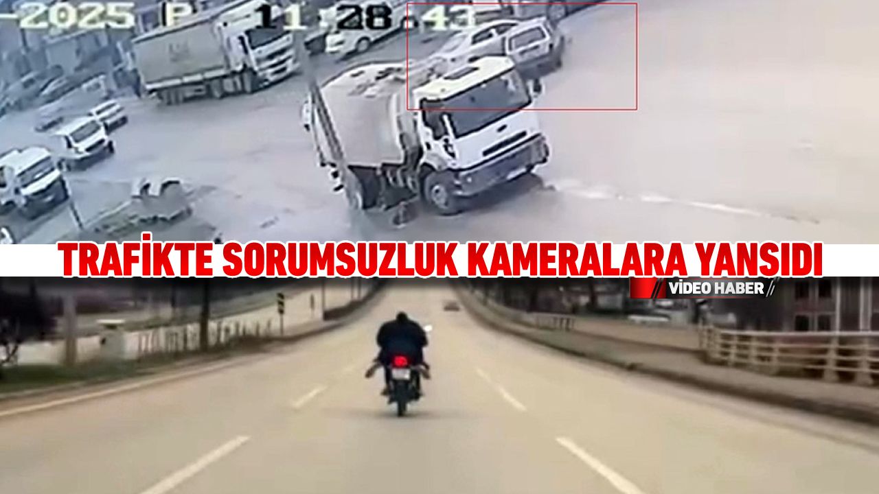 Karabük'te iki otomobilin çarpıştığı anlar ile trafikte motosikletin üzerine yatarak tehlikeli yolculuk yapan sürücü kameraya yansıdı.