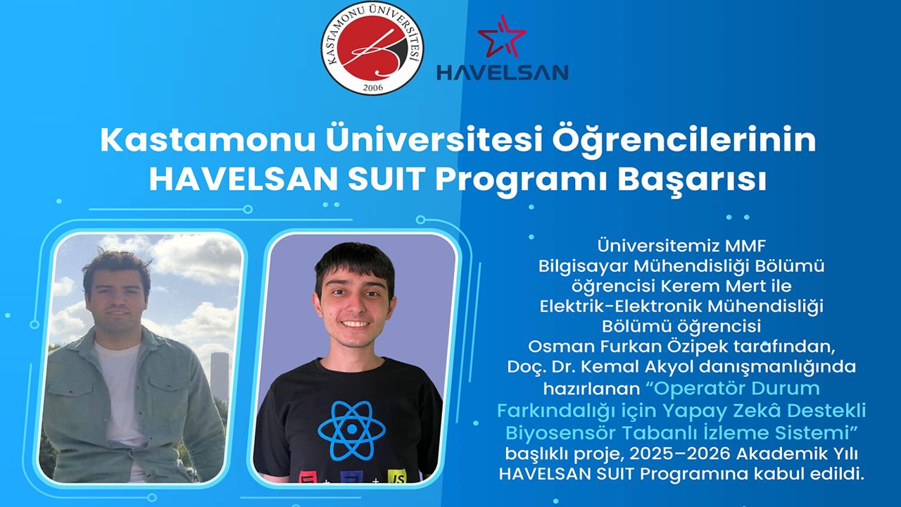 Kastamonu Üniversitesi Mühendislik ve Mimarlık Fakültesi Bilgisayar Mühendisliği Bölümü öğrencisi Kerem Mert ile Elektrik-Elektronik Mühendisliği Bölümü öğrencisi Osman Furkan Özipek tarafından, Doç. Dr. Kemal Akyol danışmanlığında hazırlanan "Operatör Durum Farkındalığı için Yapay Zeaâ Destekli Biyosensör Tabanlı İzleme Sistemi" başlıklı proje, 2025-2026 Akademik Yılı HAVELSAN SUIT programına kabul edildi.