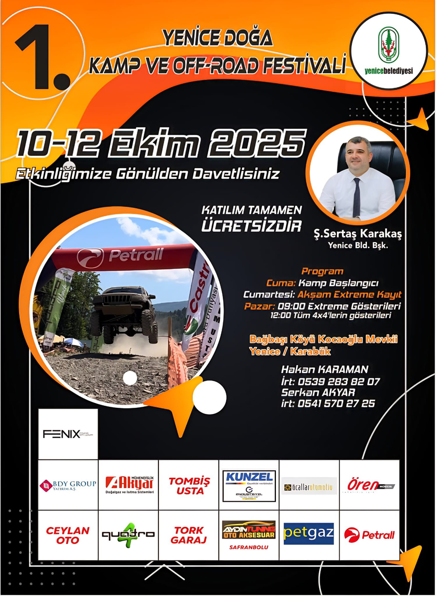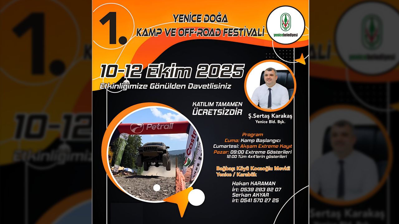 Festival kapsamında kampçılık, doğa yürüyüşleri ve off-road etkinlikleriyle katılımcılara unutulmaz bir deneyim sunulacak. Doğaseverler, kamp meraklıları ve off-road tutkunları festivalde bir araya gelerek Yenice’nin eşsiz doğasında keyifli bir hafta sonu geçirecek.