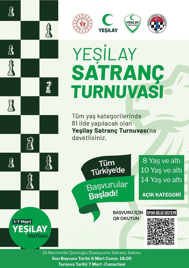 Yeşilay tarafından her yıl geleneksel olarak düzenlenen ve bu yıl 81 ilde eş zamanlı gerçekleştirilecek olan Yeşilay Satranç Turnuvası için başvuru süreci başladı. Zihinsel gelişimi desteklemek ve sağlıklı yaşam bilincini artırmak amacıyla düzenlenen organizasyon, her yaştan satranç sporcusunu bir araya getirecek.