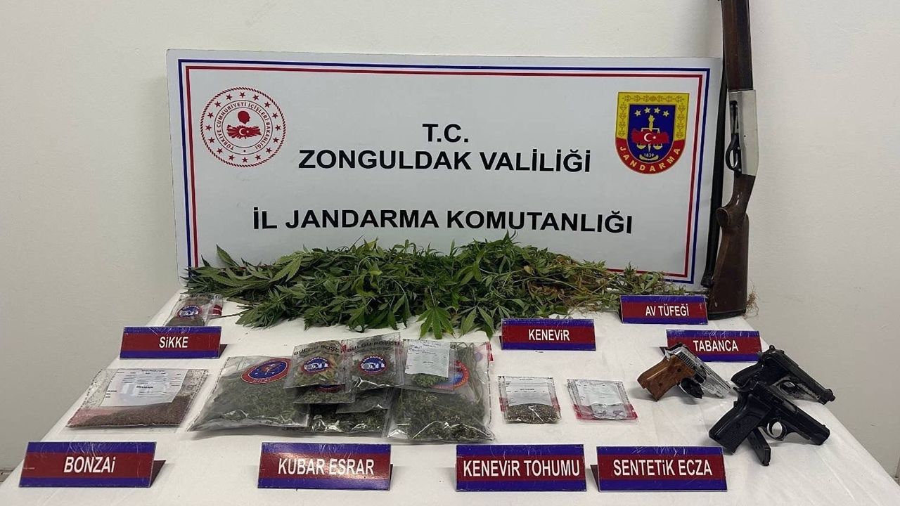 Zonguldak İl Jandarma Komutanlığı ekiplerince, Narkotik Suçlarla Mücadele kapsamında, Alaplı ilçesinde operasyon düzenlendi. Operasyonda 308 gram kubar esrar, 35 gram kenevir tohumu, 27 Gram bonzai, 14 kök kenevir bitkisi, 6 adet sentetik ecza hap, 2 adet uyuşturucu madde kullanma aparatı, 2 adet ruhsatsız tabanca, 1 adet kuru sıkı tabanca, 18 adet 9 mm tabanca fişeği, 15 adet 9 mm kurusıkı tabanca fişeği, 16 adet sikke, 1 adet av tüfeği, 2 adet cep telefonu ele geçirildi. Olayla ilgili yakalanan 2 şüpheli sevk edildikleri adli makamlarca adli kontrol şartıyla serbest bırakıldı.