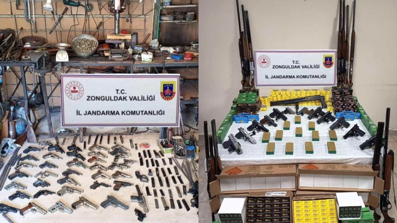 Zonguldak'ın Çaycuma ilçesinde jandarma ekiplerinin düzenlediği operasyonda, silah imalathanesi olarak kullanılan atölyede 18 tabanca, 12 av tüfeği ve yaklaşık 32 bin adet fişek ele geçirildi. Gözaltına alınan 7 şüpheliden 2'si tutuklandı.